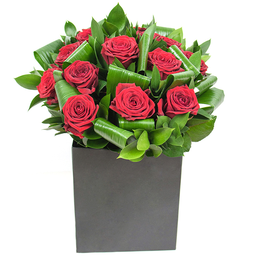 Elevate your home’s ambiance with our Exquisite Red Rose Ensemble. This bouquet features gorgeous red roses complemented by the lushness of aspidistra leaves and the delicate charm of ruscus, creating a unique and elegant arrangement.