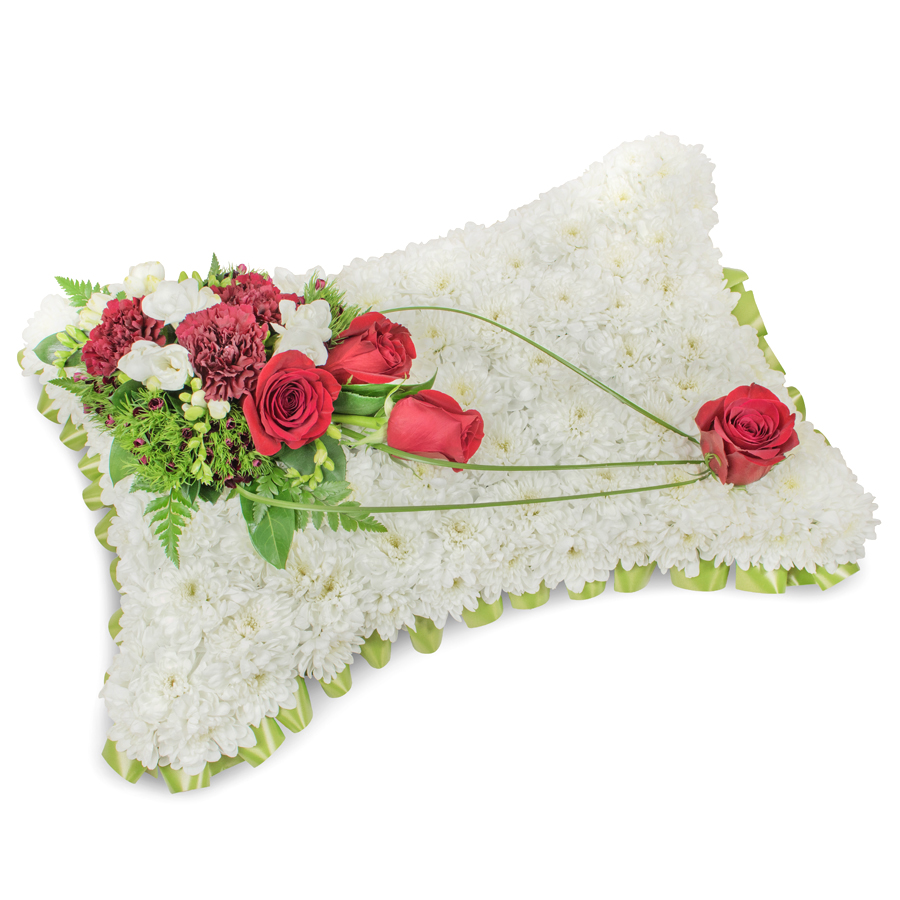 Send your condolences with our elegant bouquet, showcasing white chrysanthemums, rich red roses, pure white freesias, dark red carnations, delicate dianthus, and charming bear grass.